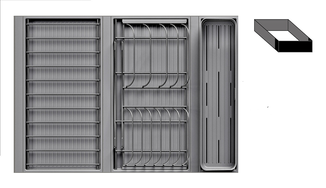 1 для столовых приборов (состоит из: 1 х емкость пластиковая 400 х 100 х 120 мм, 1 х поддон пластиковый 423 х 124 мм)